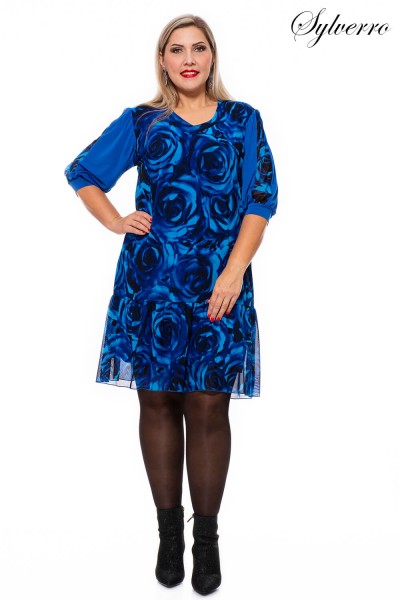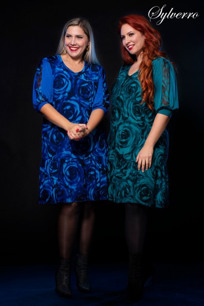 Ein hübsches Kleid mit verlängerter Linie, 3/4-Ärmeln und elastischem Netzmaterial. Gerüschter Saum, elastisches Futter, Schlaufenfutter und V-Ausschnitt. Ihr Finger ist mit einer einzigen Farbe verziert. Ein raffiniertes, einzigartiges und sehr schönes Freizeitstück.