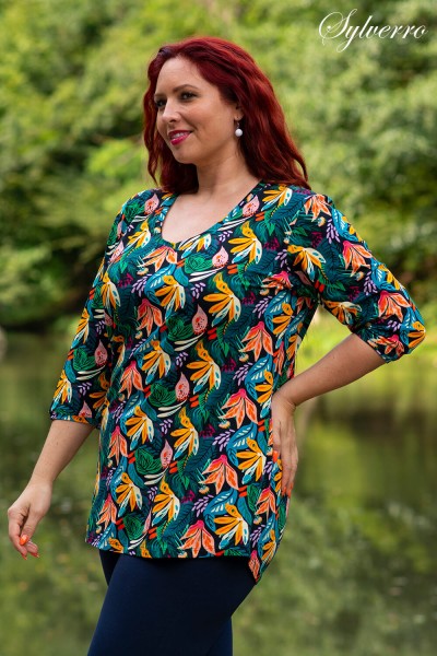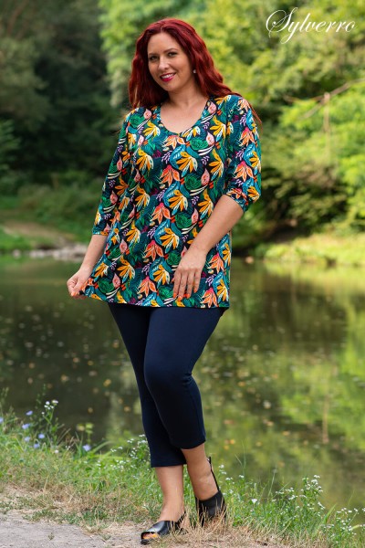 Oberteil aus reiner Baumwolle mit 3/4-Ärmeln. Ein schönes, bequemes und hübsches Stück. Es sieht an jedem Körpertyp gut aus. Wählen Sie, was Ihnen gefällt. Sein Schnitt streckt die Figur, mit überschnittenen Schultern und einer hüftbedeckenden Länge!