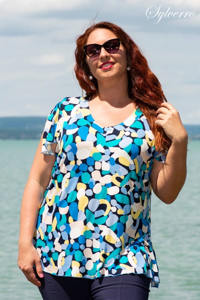 Suchen Sie ein vielseitiges und dennoch schönes, elegantes Oberteil, das Sie zu jedem Anlass tragen können? Überschnittene Schultern, ellenbogenlange Ärmel und ein wunderschöner V-Ausschnitt. Mit Rundung und Öffnung an der Unterseite. Aus hochwertigem Material, mit modischem Muster und einem Hauch Glanzdruck. Erhältlich in den Größen Small (L-XL), Medium (2-3XL), Large (4-5XL).