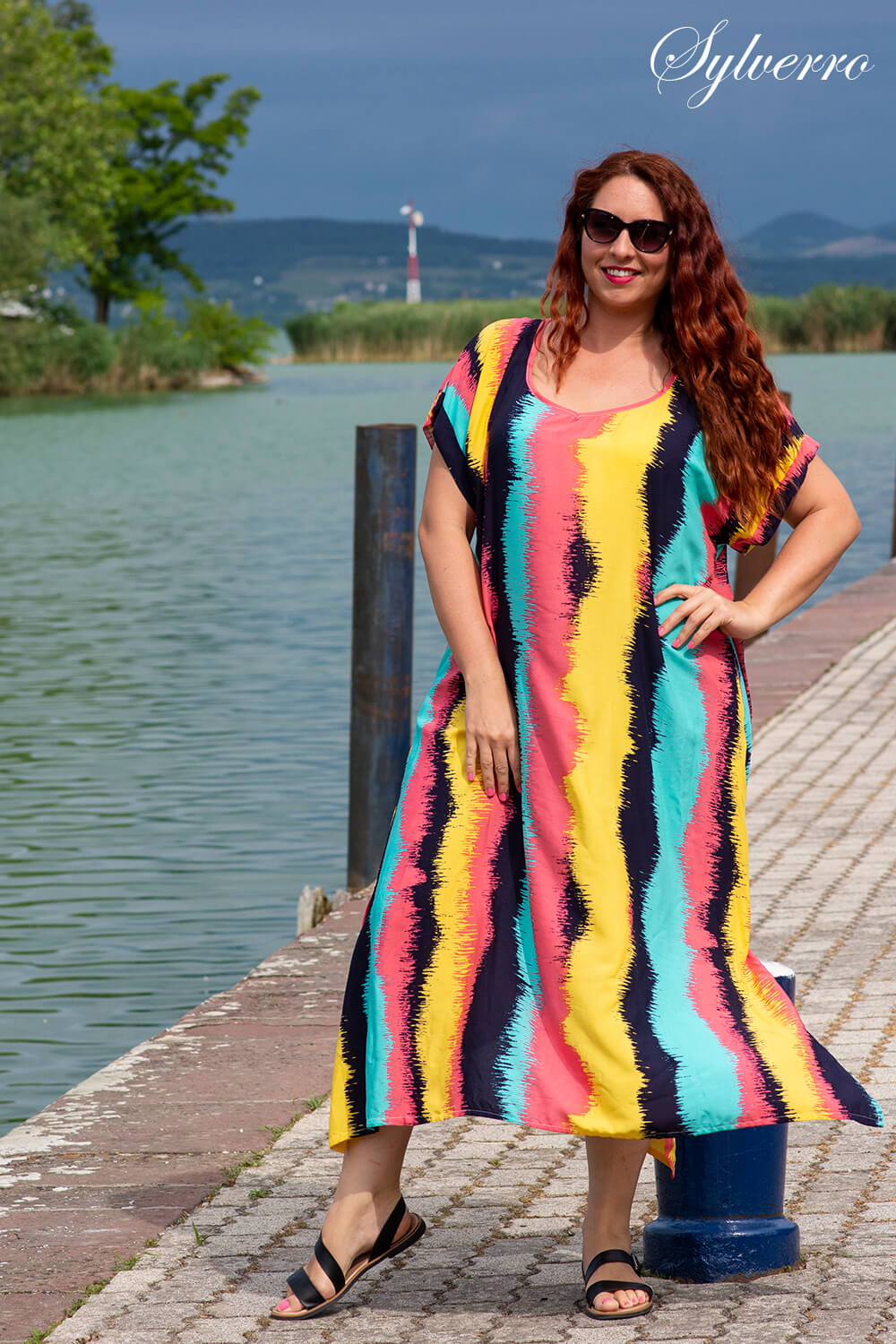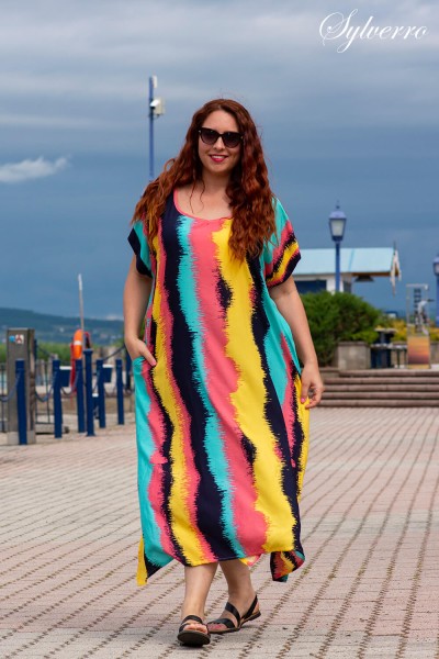 Ein langes Kleid mit lockerem Schnitt aus natürlichen Materialien, das auch bei Sommerhitze bequem ist. Sie können Ihre Hände auch beim Spazierengehen am Wasser in die Taschen stecken. Es hat überschnittene Schultern, bedeckt aber die problematischeren Teile der Arme. Erhältlich in drei Größen: Small (L-XL), Medium (2-3XL), Large (4-5).