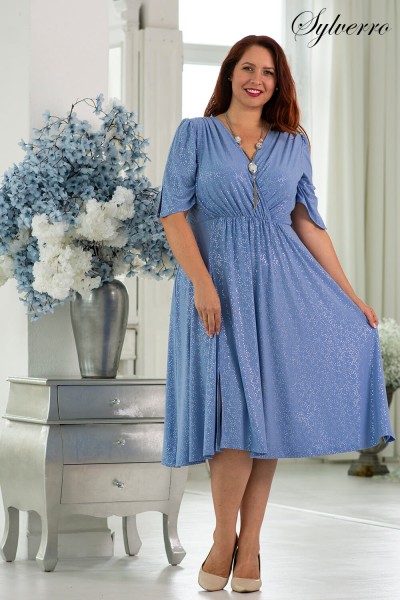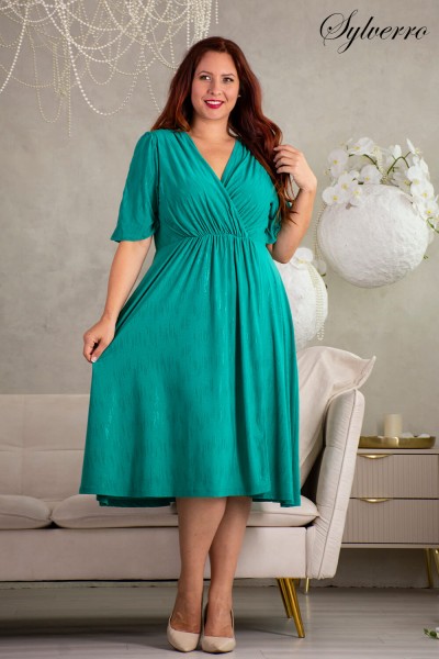 Ein hübsches, elegantes knielanges Kleid mit einer Öffnung auf der linken Seite, die teilweise im lockeren Rock verschwindet. Der überlappende Schnitt des Oberteils sorgt für ein feminines Dekolleté und eine modische Optik. Das Kleid hat einen elastischen Bund unter der Brust. Ein bequemes, elegantes und jugendliches Kleid, das durch das schöne Material noch mehr Eindruck macht.