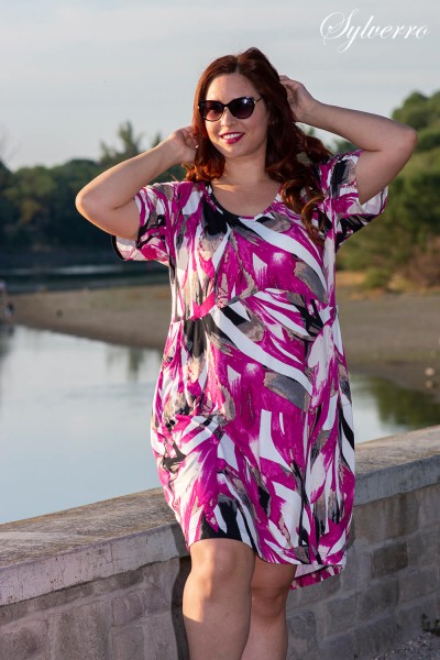 Ein bequemes, dünnes, lockeres Sommerkleid auf natürlicher Viskosebasis mit einer Länge bis unters Knie, einem modischen Schnitt, überschnittenen Schultern und Taschen. Es hat einen schönen V-Ausschnitt und eine Schnittlinie über der Taille. Kleid mit ausgestellter Taille und schrägem Saum. Größen: Klein (L, XL), Mittel (2, 3XL), Groß (4–5XL).