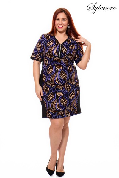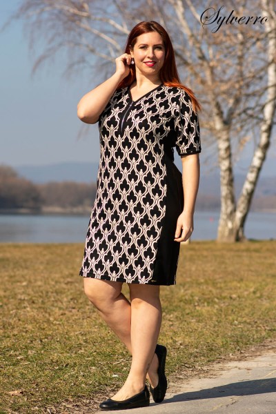 Modisches Kleid mit schlank machenden Seiteneinsätzen und auffälliger Reißverschlussöffnung auf der Vorderseite. Kurze Ärmel, über dem Knie lang, aus trendig gemustertem Material. Es ist nicht zu eng, es folgt den Linien des Körpers. Da es sich um ein dünnes Material handelt, ist es auslaufsicher und bietet Ihnen den ganzen Tag über ein angenehmes Tragegefühl. Du kannst es zu einem besonderen Anlass mit High Heels oder zu bequemen Sneakers für einen abendlichen Spaziergang tragen. Ein wirklich vielseitiges Stück.