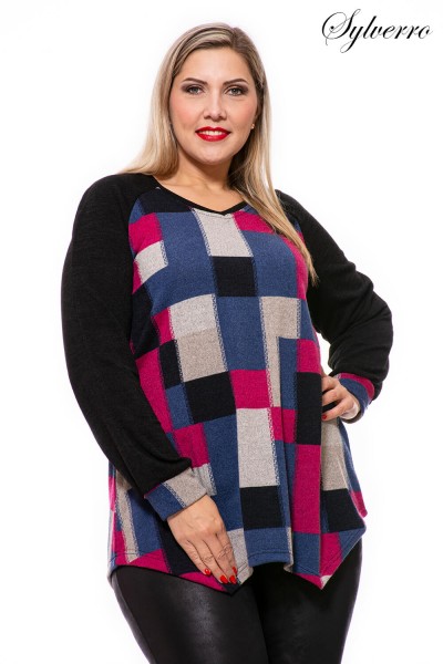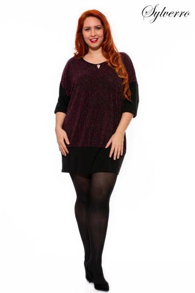 Lurex-Kleid mit sexy Netzärmeln. Der Schnitt ist nicht eng, aber Sie können die Taille mit einem Band anpassen. Vorne am Ausschnitt befindet sich ein kleiner Mesh-Einsatz mit glänzenden schwarzen Steinen. Die Modelle sind 185 cm groß. Es ist lang genug, um über das Kleid zu reichen. Man kann es auch als verlängertes Oberteil tragen.
